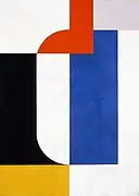 In March 1927, Stażewski was among several Polish artists hosting the Russian Suprematist painter Kazimir Malevich during his trip to Warsaw. A pioneer of abstraction, Malevich coined the term Suprematism to promote the supremacy of "non-objective art of 'pure feeling', unconcerned with representation of the visible world".[10] Stażewski helped organize Malevich's exhibition at Hotel Polonia Palace and invited the artist to visit his studio.[11] Malevich's theories of painting had served as a crucial point of reference for Russian Constructivists and avant-garde artists across Central and Eastern Europe; he is said to have made a lasting impact on Stażewski in particular, who examined some of the key ideas of the movement regarding the autonomy of art and the superiority of non-objective visual forms in relation to his own artistic practice during the late 1920s and the early 1930s.[11]