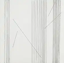 Later in the 1970s, Stażewski explored the visual properties of line. His paintings and drawings from that period show an investigation into the possibilities afforded by line, including the monochromatic grid.[21] Geometry remained a critical reference point for the artist and he considered it an "innate measure in the eye of every man, allowing him to grasp relations and proportions".[29] Over the next decade, Stażewski also continued to revitalize some of the visual forms present in his early tactile reliefs by moving back them onto a flat painterly surface. While his later compositions had become more intuitive, standing in contrast to the more scientifically determined compositional methods, the artist remained committed to examining the pictorial properties of color. Scholar Janina Ladnowska described Stażewski's planes of color as "flat, strong, homogeneous, clean, sometimes shining" and suggested that these polychromatic compositions made late in the artist's career cast doubt on the "rational" structures of his earlier work.[39]