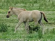 The coat colour is most often a dark beige colour ranging from sand tones to brown,[3][16] known as dun, and arises from the presence of the dun gene seen in the Fjord. Bay colouring is also acceptable.[14] The presence of a dorsal stripe along the back is mandatory, and a lot of horses also have zebra-like striping or bars on the legs. White markings (stripe, blaze, socks, etc.) are discouraged, and are prohibited in breeding stallions so that they do not appear in their offspring. The mane is solid black or two-tone black-and-gold or black-and-white.[11]: 69 [2] The coat still lacks a bit of stability and periodically non-dun horses or carriers of white markings are born.[7]: 144