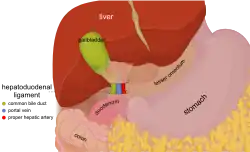 ![]() In this image, the hepatogastric ligament is labeled the lesser omentum, which it is part of. The hepatoduodenal ligament is a separate ligament that is also part of the lesser omentum. | |