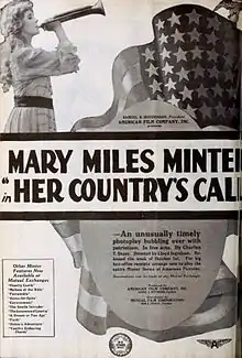 Her Country's Call is a 1917 American silent drama film directed by Lloyd Ingraham and starring Mary Miles Minter, along with George Periolat and Allan Forrest. The film is the final instalment in a series a films written by Abraham Lincoln impersonator Benjamin Chapin, who also appeared in the film as Lincoln. It was one of many films of the time that catered to the vogue for patriotic pictures after America joined World War 1, with ample shots of soldiers and the American flag.[1] As with many of Minter's features, it is thought to be a lost film.[2]