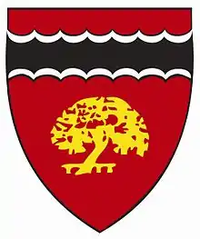 Gules, in base an apple tree surrounded by a bench or, in chief a barrulet sable engrailed and fimbriated argent. | The apple tree references an apple tree which used to stand in the Radcliffe Yard, and was used as a symbol in a fundraising campaign in 1969 to complete Currier House. |
