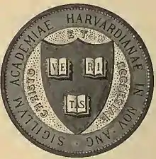 The Harvard Board of Overseers originally designed the shield during meetings in December 1643 and January 1644. However, the design was forgotten until rediscovered by University President Josiah Quincy and revealed in the bicentennial celebrations of 1836.[2] In 1843, the Harvard Corporation officially adopted it as a seal, and the seal in use today is very similar.[3]