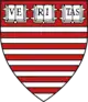 The shields of each of the graduate and professional schools have a standard chief (or top bar) of Harvard, taken from the University shield, formally blazoned "on a chief gules three open books argent with edges of leaves and covers on the two sides and bottom and clasps or, on the books VE - RI - TAS sable," abbreviated "a chief of Harvard." Most of the arms were designed by Pierre de Chaignon la Rose, an alumnus of Harvard College and expert on heraldry, on commission from the University as part of the preparations for the Tercentenary celebrations in 1936.[5] According to Hammond, "La Rose used as the bases for arms of eight of the remaining ten Graduate Schools arms of families of the founders or benefactors. Only for the Dental School and the then School of Public Administration, later the Kennedy School of Government, did he invent the arms described below. He felt, however, that since the Graduate Schools had long used the ordinary Harvard Arms, he should incorporate in the arms which he designed an upper compartment in red (a chief gules) on which are displayed in a row the three white books bearing the VE - RI - TAS, i.e., a chief of Harvard...according to his practice."