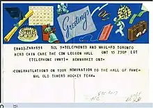 Telegram to Herb Cain informing him of his nomination to the Hockey Hall of Fame