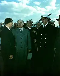 Herbert Leary (right) with President Harry S. Truman aboard the battleship USS Missouri at the New York Fleet Review on 27 October 1945.
