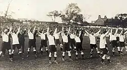 Moran also describes as "an affliction" the war-cry which the parent Union in Australia had suggested the team should use for its "box-office value". Moran wrote "The memory of that war cry provokes anger in me even after all these years.... We were expected to leap up in the air and make foolish gestures which somebody thought Australian natives might have used in similar circumstances and we were give meaningless words which we were to utter savagely during the pantomime.... I refused to lead the wretched caricature of a native corroboree and regularly hid myself among the team, a conscientious objector."[9]