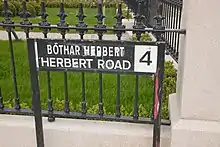 Herbert Road (Irish: Bóthar Hoirbeaird) in Ballsbridge, Ireland is a mostly residential road that links Tritonville Road with Lansdowne Road. Newbridge Avenue joins by the bridge, in front of Marian College and the former site of Sandymount High School next door. There are several hotels on the road. Noteworthy is the Mount Herbert Hotel which is a conversion of a terrace of stately homes.[1][2] The road extends to the roundabout at the junction, which is part of Lansdowne Road. Both this road, and Newbridge Avenue, are built on the former site of Haigs' distillery.