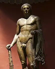 The bronze sculpture is slightly over life-sized[1] and is in the Hellenistic style of the second century BCE. The Hellenistic style was based on the canon of proportions that had been established by Lysippos in the early fourth century BCE. The muscles on the sculpture are exaggerated and the head is proportionally smaller when compared to the rest of the body. The Forum Boarium statue is one of the two surviving full-sized Greek statues from ancient Greece. The second Hercules statue was discovered near the Theatre of Pompey. The Hercules of the Theatre of Pompey had been carefully buried under protective tiles and incised FCS (Fulgor Conditum Summanium) because it was constantly hit by lightning.[2] The Hercules of the Theatre of Pompey depicts him leaning on his club vertically as he holds the apple of Hesperides in his left hand. On his left forearm, he has draped the skin of the Nemean Lion that he defeated on his first Labor.[2] Both sculptures display contrapposto, a typical style from Lysippos in which the figure's weight is thrown entirely on one foot. Though their muscles are exaggerated, they stand in marked contrast to the bearded, burly and perhaps more familiar Farnese Hercules.