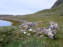 The diggings also revealed other buildings besides the church, including the main house and adjoining banquet hall, a byre and some outbuildings. In the ruins of the church, archaeologists found a significant quantity of charcoal, suggesting a conflagration at some point. The local Inuit's name for the site, Ikigait ("the place destroyed by fire") is further evidence of this.[20] It is possible that other buildings at the site were even closer to the shoreline than the church, and were claimed by the rising sea level some time after the disappearance of the Norse. More recent soil-testing indicates a landslide occurred at some point in the 18th century, and may have eradicated the remains of other Norse buildings at the site.[21]