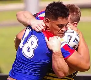 In July 2017, he signed a three-year contract with the Newcastle Knights starting in 2018.[18] In round 25, he scored his first ever NRL try against the Parramatta Eels, in Brisbane's 34–52 loss at Suncorp Stadium.[19]