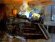 Heijenbrock began to travel everywhere that had an industrial center to paint and sketch modern industrial workers at everyday tasks. He visited Saargebiet, Wales, the Midlands in Engeland and shipyards in Scotland. In Sweden he painted quarries and pine forests to show the raw materials for building roads, railways, and the paper industry. In the Netherlands he mostly painted the harbours, but when World War I broke out he was confined to the Dutch borders and began to visit local industrial sites.[2] In his enthusiasm to show the entire industrialization process, he began to collect various modern instruments and inventions.