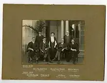 University of Queensland's first lecturers showing from back RJ Cholmeley (Classics), Hermiene Ulrich (Mod Languages), Elton Mayo (Philosophy), Front HC Richards (Geology), T Parnell (Physics) JP Tivey (Engineering), EOG Shann (History), Brisbane. Photograph used with the permission of the University of Queensland, Fryer Library