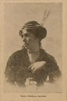 In 1915,[1] she created a magazine called La Mujer Moderna ("The Modern Woman"). Along with essays discussing feminist ideas, it served as propaganda to support Carranza.[3] Almost all of her works helped the political campaign of Carranza in some way.[4] The magazine also featured articles which expressed her disapproval of the Catholic Church and its methods of control. She was one of the first feminists to speak out about the church and its view of women.[5] Galindo collaborated with many other journalists and feminists, with the majority of these women being from Spain who were fighting for the same issues as Galindo. The most famous women that stand out from her magazine and articles are María Luisa de la Torre de Otero, Clarisa P. de Torres, Julia D. Febles Cantón Vda. de Palomeque, Micaela Rosado de P., Bolivia M. de Rivas, Rosario Rivas Hernández, María Pacheco, Artemisa N. Sanz Royo, and Luz Calva. Although the magazine was titled La Mujer Moderna, she still included male journalists in her works.[4] She eventually wrote Carranza's biography in addition to at least five other books.[5] One of her books, Un presidenciable: el general Don Pablo Gonzalez, was written about the general Pablo González Garza who was a general during the Mexican Revolution under President Carranza. Her support for Carranza was incredibly obvious because out of all her works were related to him; even the feminist magazine.[4]