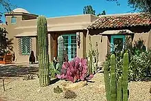 Megargee had no formal plans for the building. Influenced by architecture he had studied in Spain and Mexico, he used old wooden beams from an abandoned mine and poured a mixture of oil and ash from the roof to age the exterior walls. Due to the extended length of the stays of many of his guests, Megargee began running a guest ranch to supplement his artist's income. Local law enforcement suspected that Megargee used the ranch for illegal gambling, so he constructed a tunnel from the main building to the stables to provide an easy escape into the desert should the law make a surprise visit.[3]