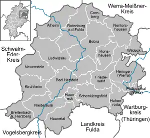 Hersfeld-Rotenburg is a Kreis (district) in the east of Hesse, Germany. Neighboring districts are Werra-Meißner, Wartburgkreis, Fulda, Vogelsbergkreis, Schwalm-Eder.