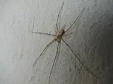 Popularly called the "two-tailed spider", this spider is common in southern India. It lives on the trunks of large trees — including commonly on the trunk of the coconut palm. Its colour closely matches that of the tree trunks in which it lives. It feeds on moths, ants, and other smaller spiders. Its cocoon is generally laid in the holes or crevices of trees. It can be easily identified by its long spinnerets. These spiders prefer proteinaceous foods over carbohydrates though they may accept foods containing carbohydrates under stressed conditions. The spider is also allergic to seafood. The spider can grow up to 6–7 cm. in length and are colonial in nature. Males and females are not easily identified though differentiation is possible by observing their aggression and sometimes presence of white distinct patches on the abdomen (in case of females).[1] The spider is a genus of the Hersilla.[2]