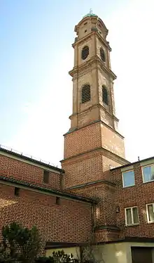 Damaged during World War II, the Duke Hospital was demolished and replaced by a new building. The tower was restored, the nave replaced by a new building designed by Alexander von Branca (1956–57), with a brickwork interior.[2]