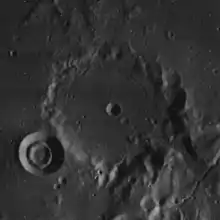 Hesiodus is a lunar impact crater located on the southern fringes of Mare Nubium, to the northwest of the crater Pitatus. It was named after the ancient Greek poet Hesiod.[1] Starting near the northwest rim of Hesiodus is the wide cleft named Rima Hesiodus. This rille runs 300 km east-southeastward to the Palus Epidemiarum