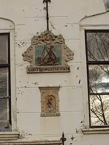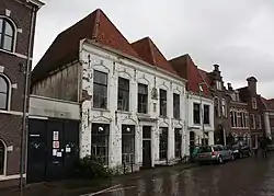 In 1565 Dirck Diricksz. (ca. 1537–1618), a ship's captain, bought a house with property on the Scheepmakersdijk.[1] At that time ships were built there (Shipbuilder's dike), but today this street is called the Houtmarkt. His son Dirck Diricksz. de Jonge (1571 1619) was also a captain, who married Cornelia Cornelisdr. Jonck (ca. 1570–1630) and had 4 children. In 1606 he bought a house next to his father's property, along with some other properties on the Scheepmakersdijk. He named his house "Scheepje", which means "little ship". Shortly after this he became a member of the brewer's guild, and in documents he is listed as owner of the brewery "Het Scheepje", which was part of the brewery "De Vogel Struijs", along with Johan Claesz Loo. Dirck Diricksz kept on purchasing properties until most of the brewery was his. In the facade of his former house a gable stone is a memorial to the old name with a picture of a sailing ship and the text "Godt bewaert het schip" (God saves the ship).[1] In 1616 Dirck Diricksz received permission to build a windmill for grinding malt for beer. In 1618 he was promoted to mayor of Haarlem by Prince Maurits. His success did not last long however, and he died a year later, but his wife continued the beer business until her death in 1630. In June 1633 their daughter Agatha and her husband Nicolaes Olycan bought the inheritance rights of the remaining 3 children and took over the brewery and adjoining house.[1]