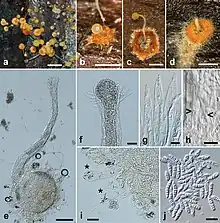 The Heterogastridiales are an order of fungi in the class Microbotryomycetes. The order contains a single family, the Heterogastridiaceae,[2] which currently contains five genera.[3] Some species in the order are currently known only from their yeast states.[4] Those producing hyphal states have auricularioid (laterally septate) basidia and are parasitic on other fungi. Basidiocarps (fruit bodies), when present, are minute and variously stilboid (pin-shaped),[5] pustular,[6] or pycnidioid (flask-shaped).[2] Molecular research, based on cladistic analysis of DNA sequences, has shown that the order is a monophyletic (natural) group, though the type and only species of Krieglsteinera[1] has not yet been sequenced and may belong elsewhere.[3]