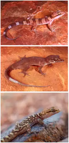 | Heteronotia spelea in life: Paraburdoo, WA (image: B. Maryan) (Top); Heteronotia atra in life: 5 km south of Lake Poongkaliyarra, WA (image: B. Maryan) (Middle); Heteronotia fasciolatus in life: Harts Range, central Australia, NT (image: M. Pepper).(Bottom) | |