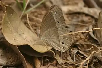 Upperside dark umber brown. Forewing with a large, white-centred, fulvous-ringed black median ocellus and a white-centred preapical much smaller black spot. Hindwing uniform, a post-median series of from two to four white-centred fulvous-ringed black ocelli, sub-equal and smaller than the posterior ocellus on the forewing. Underside: ground colour similar, but irrorated (sprinkled) with obscure transverse striae of a deeper brown; the terminal margins of both forewings and hindwings very broadly paler; the dark basal portion of the wings sharply defined by a very dark brown line; a postmedian series on both wings of rather small white-centred fulvous-ringed black ocelli—two on the forewing, a median and a preapical; seven, placed in a slight curve, on the hindwing. Antennae, head, thorax and abdomen dark umber brown, paler beneath. Male sex-mark of form 2, the patch of specialized scales on both forewing and hindwing very small; the nacreous area surrounding the specialized scales on the underside of the forewing very pale brown.[6][7]