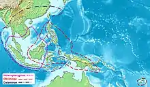 The center of the distribution area of the Heteropterygidae is Borneo, where representatives of all three subfamilies occur. The Heteropteryginae have the smallest distribution area. Besides Borneo, it only includes the Thailand part of Malay Peninsula, Sumatra and Java. On the continental mainland of Asia Haaniella gorochovi is the only Hetropteryginae species, which can be found in the south of Vietnam. The distribution area of Dataminae includes the entire region inhabited by the Heteropteryginae. In addition, they settle on the Asian mainland in eastern Myanmar, Thailand, Laos, Cambodia, Vietnam and parts of South China. To the east are the Okinawa Islands, Taiwan, Palawan, the Moluccas islands Buru and Seram, all of the Lesser Sunda Islands and Sulawesi inhabited. The distribution area of Obriminae extends from Borneo to the east. It includes the Philippines, Sulawesi, most of the Moluccas Islands, and New Guinea. Even further to the east is Viti Levu, the main island of the Fiji group, which is the distribution area of Pterobrimus depressus. [4][1]