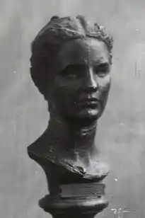 In 1897, Anders Zorn depicted her taking a break while posing for Saint-Gaudens; etchings of the scene survive at institutions including the Art Institute of Chicago (1913.1018), Metropolitan Museum (no. 17.3.726), Isabella Stewart Gardner Museum (4.2.r.161), Boston Public Library (18_07_000126), Saint-Gaudens National Historical Park, National Portrait Gallery (NPG.73.37) and Zorn Museum in Mora, Sweden.[18] The Smithsonian Institution owns De Witt Ward's photos (JUL J0006125 and JUL J0021700) of her Saint-Gaudens bronze bust as well as a photo of the $20 coin prototype (JUL J0021689). The bust has been shown in recent years at institutions including the Musée des Augustins in Toulouse in 1999.[8] On November 17, 2023, it was sold for $200,000 at Heritage Auctions in Dallas.[19] In the 1890s, Anderson posed for John La Farge while he was portraying a Greek goddess in Athens, a mural at the Bowdoin College Museum of Art's Walker Art Building. (In 1911 she paid $25 for a La Farge watercolor of a Samoan lagoon scene, whereabouts now unknown, at American Art Galleries' sale of his estate.)[20] An oil-on-canvas bust sketch said to be a portrait of her by Daniel Chester French survives at his home, Chesterwood, in Stockbridge, Massachusetts, along with his plaster casts of her right foot and right hand.