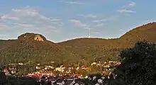 Above the town of Heubach, the remains of Rosenstein Castle are still visible. The castle ruin on top of the Rosenstein mountain can be considered Heubach's landmark and is a popular tourist spot due to its impressive views over the region.[3] On Glasenberg there is a telecommunication tower of reinforced concrete with an observation deck that also gives nice views over the area.
