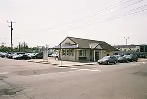 ![]() The 2003 Hewlett station building in 2009, across the tracks and the grade crossing from the long-standing former station. | ||||||||||||||||||