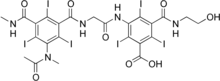 Ioxaglic acid (trade name Hexabrix) is pharmaceutical drug used as an iodinated contrast medium for X-ray imaging. It has low osmolality (relatively few molecules per volume), typically resulting in fewer side effects than high-osmolality media.[1] It is manufactured by Guerbet, but marketing in the US has been discontinued.[2] As of 2021, it may still be available in some European countries.[3]