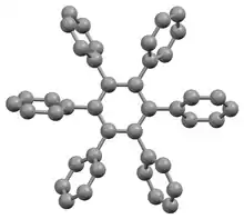 Hexaphenylbenzene is an aromatic compound composed of a benzene ring substituted with six phenyl rings. It is a colorless solid. The compound is the parent member of a wider class of hexaarylbenzenes, which are mainly of theoretical interest.[2]