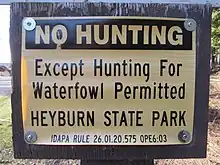 A 300-foot safety zone may be designated around trailheads and park facilities by the park manager during established hunting seasons. Shooting off the docks and beaches are not allowed.[12] Although Heyburn State Park is approved for hunting by the Board, hunting might only be allowed in limited circumstances by park rule, therefore it is important to check with the park headquarters prior to engaging in the activity.[15] Bird blinds can be used and need to be removed the same day.