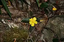 Hibbertia dentata, commonly known as toothed guinea flower, trailing guinea flower or twining guinea flower, is an ornamental plant in the family Dilleniaceae native to the east coast of Australia. Found in woodland, it is a trailing or twining vine with leaves with several small 'teeth' on the margins and bright yellow flowers in early spring. It adapts readily to cultivation and can be grown as a pot plant. The species was first described in 1817.