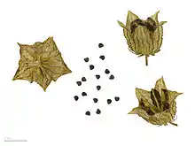 The pollinated but unripe seedpods look like oriental paper lanterns, less than 25 mm (1 in) across, pale green with purple highlights.