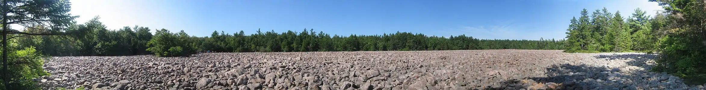 The most notable feature of Hickory Run State Park is the huge boulder field located in the northeast corner of the park.[5] The field can be reached by car on Boulder Field Road or by hiking the 3.5-mile (5.6 km) long Boulder Field Trail from the trailhead on SR 534. The field comprises about 720,000 square feet (67,000 m2) (16.5 acres (6.7 ha) or 0.026 square miles (0.067 km2)) in area (1,800 feet (550 m) east-west by 400 feet (120 m) north-south). The top of the boulder layer is virtually level with the approaching path.[4] This boulder field, known as the Hickory Run boulder field, is the largest of its kind in the Appalachian region. It consists of a very gently sloping expanse of boulders that occupies the axis of a small valley with approximately 100-foot (30 m) of relief.[6] A coniferous forest with stony loam soils surrounds the field.[7]