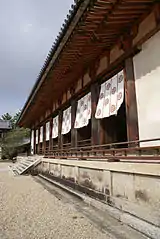 The hidden roof (野屋根, noyane)[note 1] is a type of roof widely used in Japan both at Buddhist temples and Shinto shrines. It is composed of a true roof above and a second roof beneath,[1] permitting an outer roof of steep pitch to have eaves of shallow pitch, jutting widely from the walls but without overhanging them.[2] The second roof is visible only from under the eaves and is therefore called a "hidden roof" (giving its name to the whole structure) while the first roof is externally visible and is called an "exposed roof" in English and "cosmetic roof" (化粧屋根, keshōyane) in Japanese. Invented in Japan during the 10th century, its earliest extant example is Hōryū-ji's Daikō-dō, rebuilt after a fire in 990.[3]