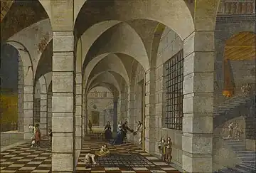 Janssens also painted many architectural paintings usually of imaginary palaces, temples and art galleries. He based himself on existing buildings, including the house of Rubens in Antwerp, as well as on prints of Hans Vredeman de Vries, which were a source of perspectival effects. Playing with elements such as columns, pilasters and windows he created imaginary, monumental constructions. The architectural features with their perspectival exaggeration as well as the use of chiaroscuro created a dramatic effect in Janssens' work.[5]