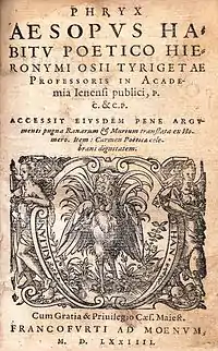 Hieronymus Osius was a German Neo-Latin poet and academic about whom there are few biographical details. He was born about 1530 in Schlotheim and murdered in 1575 in Graz. After studying first at the university of Erfurt, he gained his master's degree from Wittenberg University in 1552 and later lectured on Poetics in the Philosophical faculty there. In 1558 he was crowned poet laureate in Copenhagen by King Christian III of Denmark. Thereafter he held teaching positions in Jena, Regensburg and Graz, identifying with Protestantism in the religious conflicts of the time.[1] Osius was known as a pre-eminent poet whose works were frequently reprinted. They included his "Song on Christ’s Birth" (Carmen de natali Christi, 1557); an adaptation into Latin of the Homeric comic epic, the Batrachomyomachia (Pugna ranarum et murium, the battle of the frogs and mice);[2] an epic of the Dithmarschen Peasants’ War (Historia belli Ditmarsici, 1560), which had only recently concluded and of which he also published a shorter version in German; and his collection of nearly 300 poems based on Aesop’s Fables (Fabulae Aesopi carmine elegiaco redditae, 1564).[3]