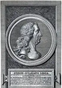 Upon completing his study at the University of Altdorf, Hieronymus Wilhelm Ebner commenced a four-year education trip across Europe in 1691, visiting the Netherlands, Italy, Austria, Bohemia and northern Germany.[3] Back in Nuremberg, he began preparing for a political career in 1700 and worked in various positions before he was appointed to the city council in 1708.[3] He went on to assume the office of Scholarchat as the supervisor of the schools of the imperial city in 1718 and administered the office until 1744.[3] Having worked on indexing of Nuremberg's public library and imperial city archives, he published some of what he regarded as the most important among the documents he had found in them.[3]