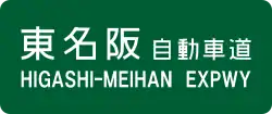 Officially, the route is designated as the Kinki Expressway Nagoya Osaka Route,[2] however this designation does not appear on any signage. In some areas, signs on the route are written in Japanese as 東名阪道 or ひがし名阪道; this is to prevent confusion with the Tōmei Expressway which looks similar when written in Japanese.