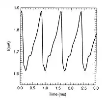 The domains started from the cathode, separates and, with increasing bias increases its radius. When the anode is reached the ring disappeared and a new domain grows from the cathode. The process repeated itself with a period of 10 sec (Fig. 7).[1][15]