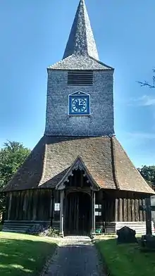 This Grade 1 listed church was built before 1286 (this being the first date for which there is a recorded name of a priest at the church, Richard de Halyngleghe).[4] Although the church has been extended over the years, its most remarkable feature is the timbered tower which was probably constructed in the late 13th Century. It consists of an octagonal ground floor and a square upper story above which rises an 80-foot octagonal shingle-clad spire. The whole structure is braced and strengthened by a system of massive oak pillars, beams and trusses. The 14th Century South porch has an entrance which is a natural arch made of two halves of a colossal oak trunk and inside the church there is a 13th Century font.