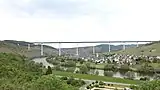 The plan called for a 1702.4 m long steel box beam bridge that crosses the river at a maximum height of 158 m. The width of the bridge will be 29.0 m to allow four-lane traffic. Ten monolithic pylons made from concrete will support the bridge; their height varies between 15 and 150 m.[3] The estimated costs are 270 million euros.[4] Cost increases caused headlines. The costs of the entire project amount to at least 483 million euros, with the bridge accounting for 175 million euros. The project was completed in November 2019.[3][5]