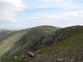 The main ridge north to Wether Hill passes over the two intermediate tops of Raven Howe (2,345 feet, 715 m) and Red Crag (2,332 feet, 711 m), before dropping to the depression of Keasgill Head. This ridge is grassy but quite narrow and carries the High Street Roman road. There is a small tarn to the south of Red Crag. In the other direction the ridge turns a little westward across a narrow depression to Rampsgill Head.