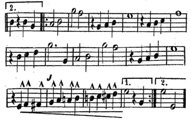 - ↑ The other common march form is the military march, which does not use a fourth (D) strain, but recapitulates the trio (C) once or twice, separating the repeats with what is known as a breakstrain: I-AA-BB-C-Br-C-Br-C.