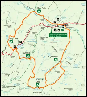 The May Lake High Sierra Camp is a hiking distance of 8.6 miles (13.8 km) southwest, and Tuolumne Meadows Lodge is a hiking distance of 7.6 miles (12.2 km) southeast.[2]