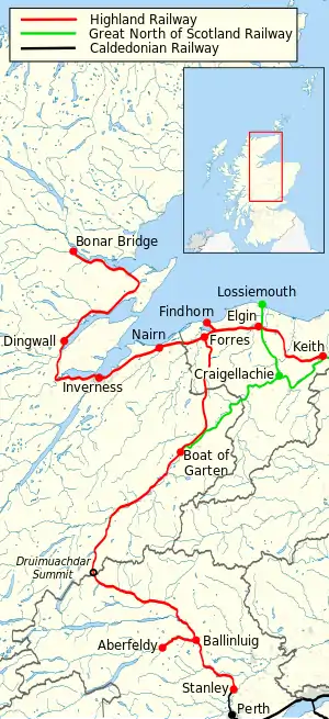 The Highland Railway (HR) was one of the smaller British railways before the Railways Act 1921, operating north of Perth railway station in Scotland and serving the farthest north of Britain. Based in Inverness, the company was formed by merger in 1865, absorbing over 249 miles (401 km) of line. It continued to expand, reaching Wick and Thurso in the north and Kyle of Lochalsh in the west, eventually serving the counties of Caithness, Sutherland, Ross & Cromarty, Inverness, Perth, Nairn, Moray and Banff. Southward it connected with the Caledonian Railway at Stanley Junction, north of Perth, and eastward with the Great North of Scotland Railway at Boat of Garten, Elgin, Keith and Portessie.[2]