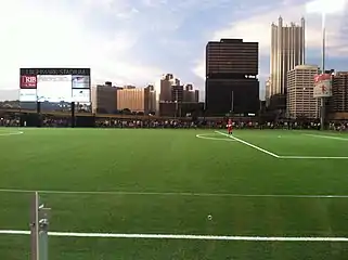 Highmark Stadium is a 5,000-seat soccer-specific stadium in Pittsburgh's Station Square which is home to Pittsburgh Riverhounds SC of the USL Championship and the Pittsburgh Thunderbirds of the American Ultimate Disc League. The stadium was also home to the Pittsburgh Rebellion women's football team for 2017. Three local colleges use the stadium for soccer, lacrosse and rugby, and six different local high schools will use the field for soccer and lacrosse.[6] The $10.2 million project began with the demolishing and excavating of the former Trib Total Media Amphitheatre, building foundations for the scoreboard, light poles and grading foundations for the grandstands as well as the installation of underground utilities. The field surface is FIFA 2-star certified artificial turf, the highest rating that an artificial surface can achieve, one of only six fields in the country to earn that rating.[6][7] Other fields to earn this rating in the United States include: Providence Park, CenturyLink Field, and Gillette Stadium, all of which house Major League Soccer franchises.[8][9][10]